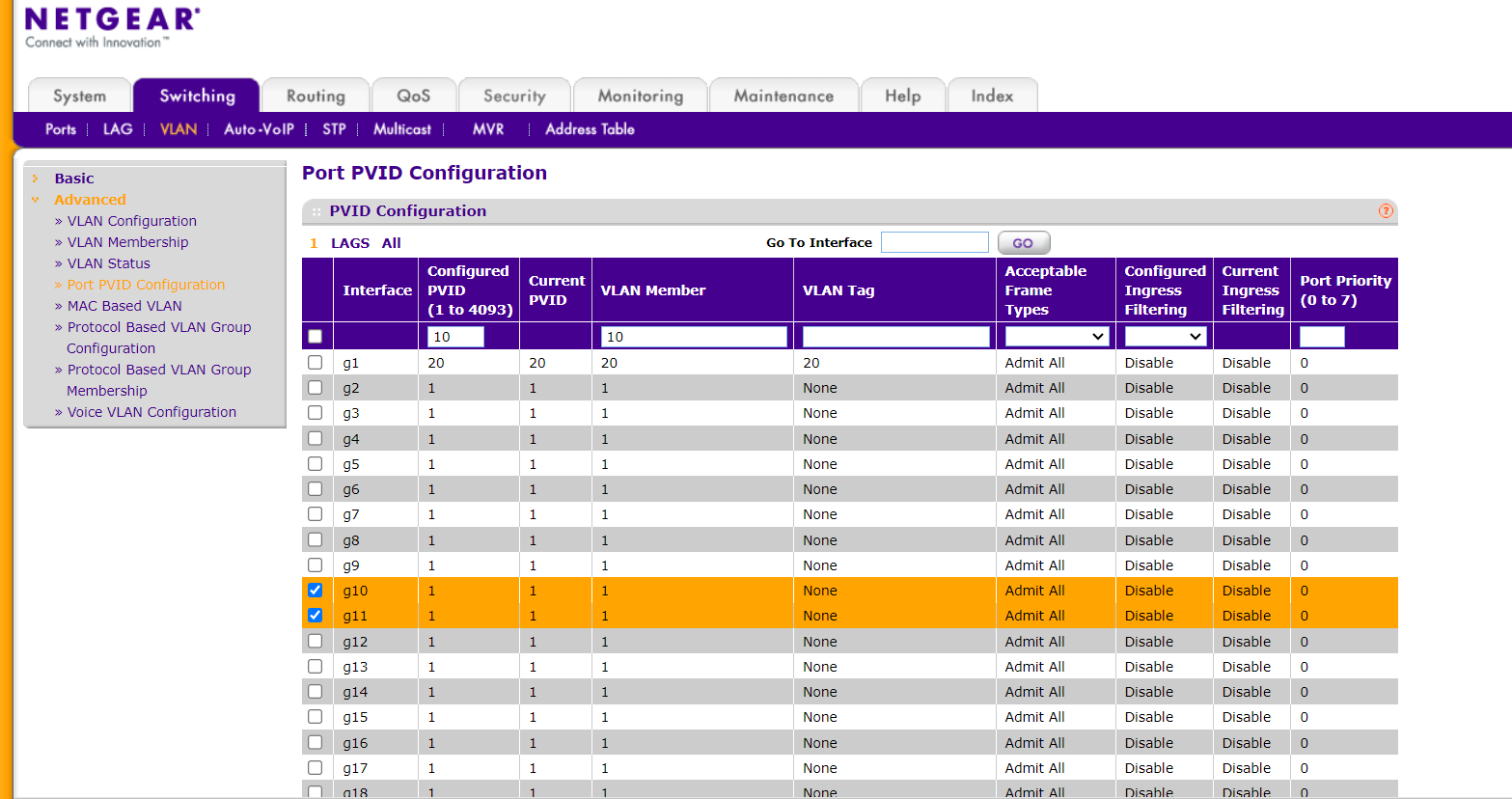 VLAN Membership 항목에서도 변경할 수도 있지만, PVID도 같이 변경을 위해, Port PVID Configuration 항목에서
