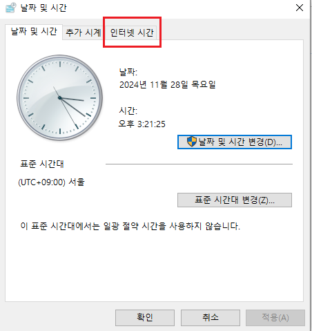 2) 날짜 및 시간 탭에서 인터넷 시간 선택