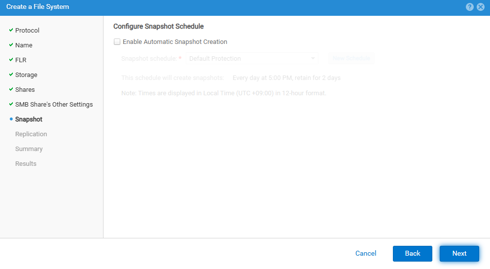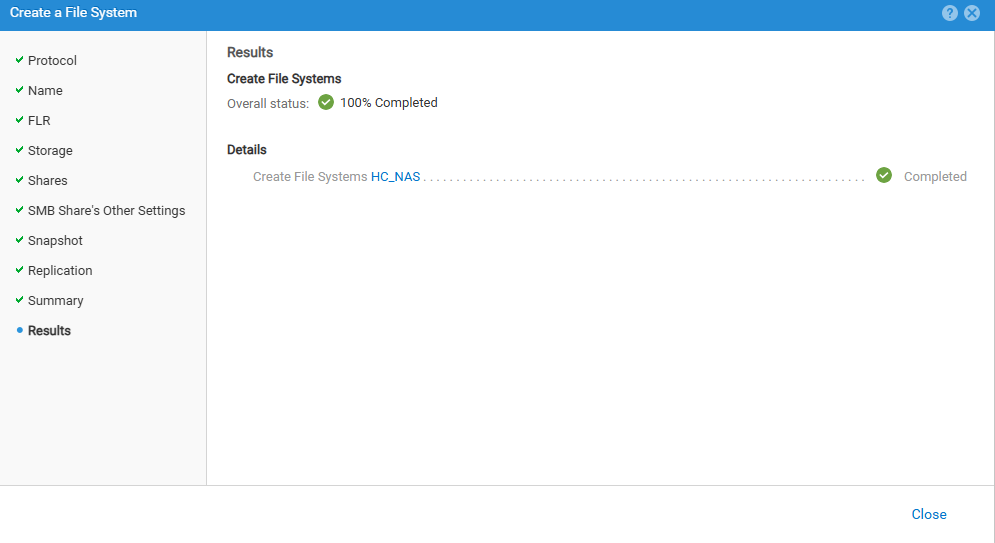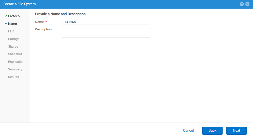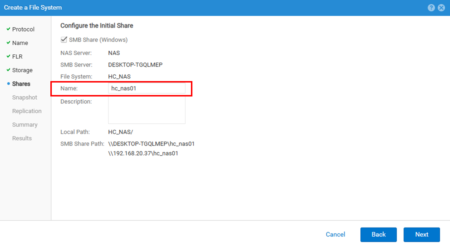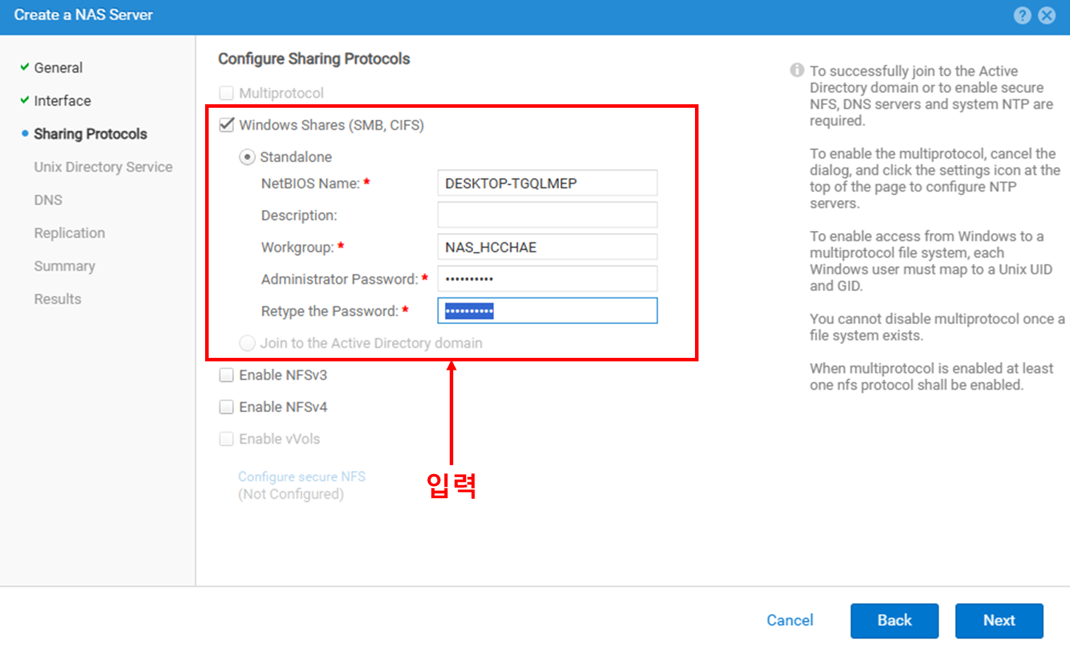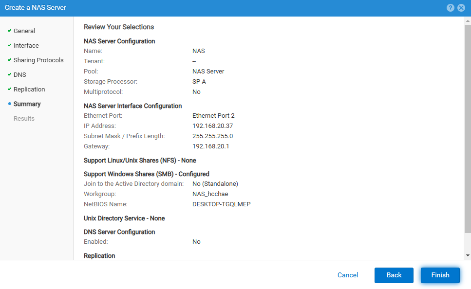 - 사용할 NAS Server 이름, Pool, Storage Processor을 선택합니다.