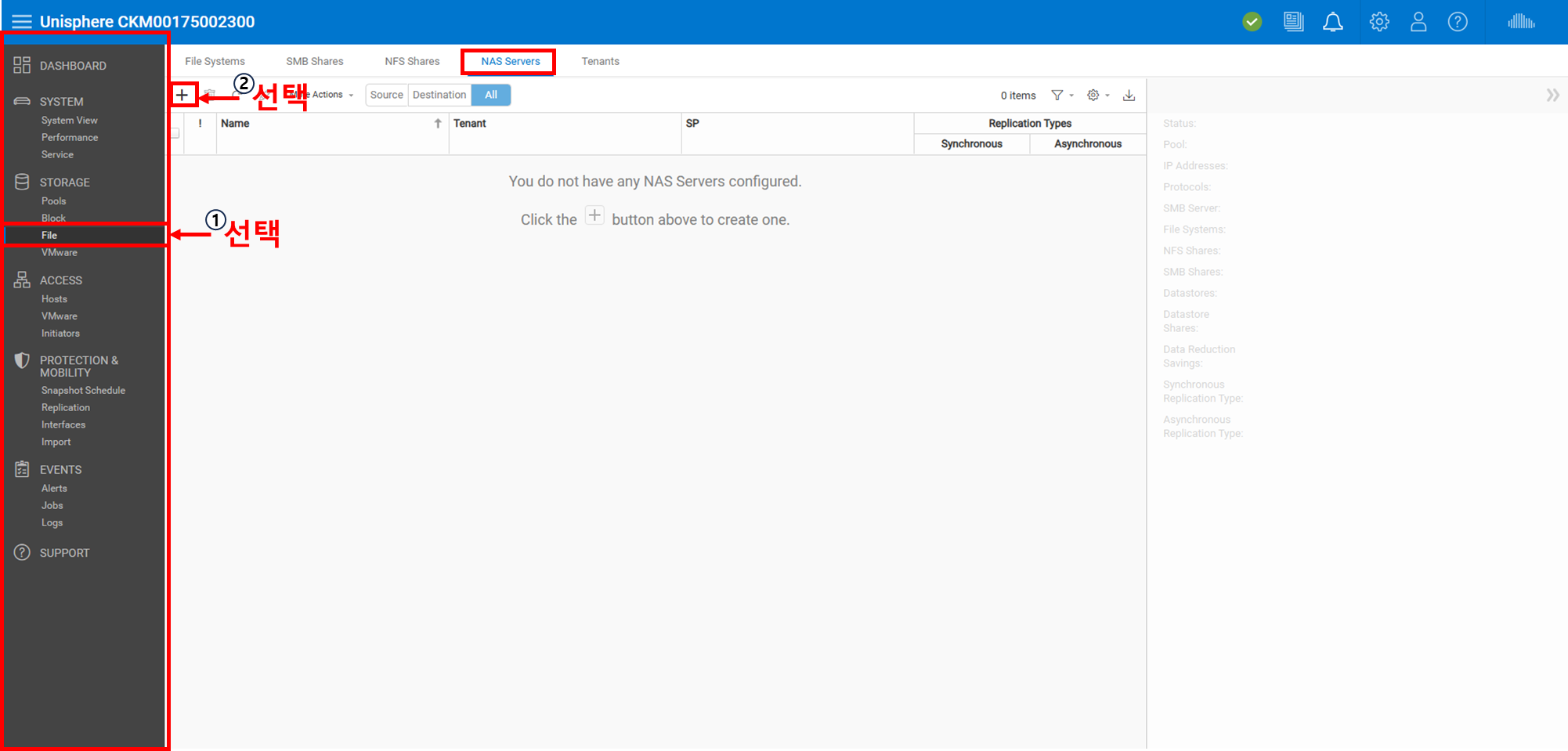 - 사용자 인터페이스 창에서 왼쪽 메뉴에서 STORAGE 하단에 File을 선택 후 상단에 NAS Servers 탭으로 이동합니다.