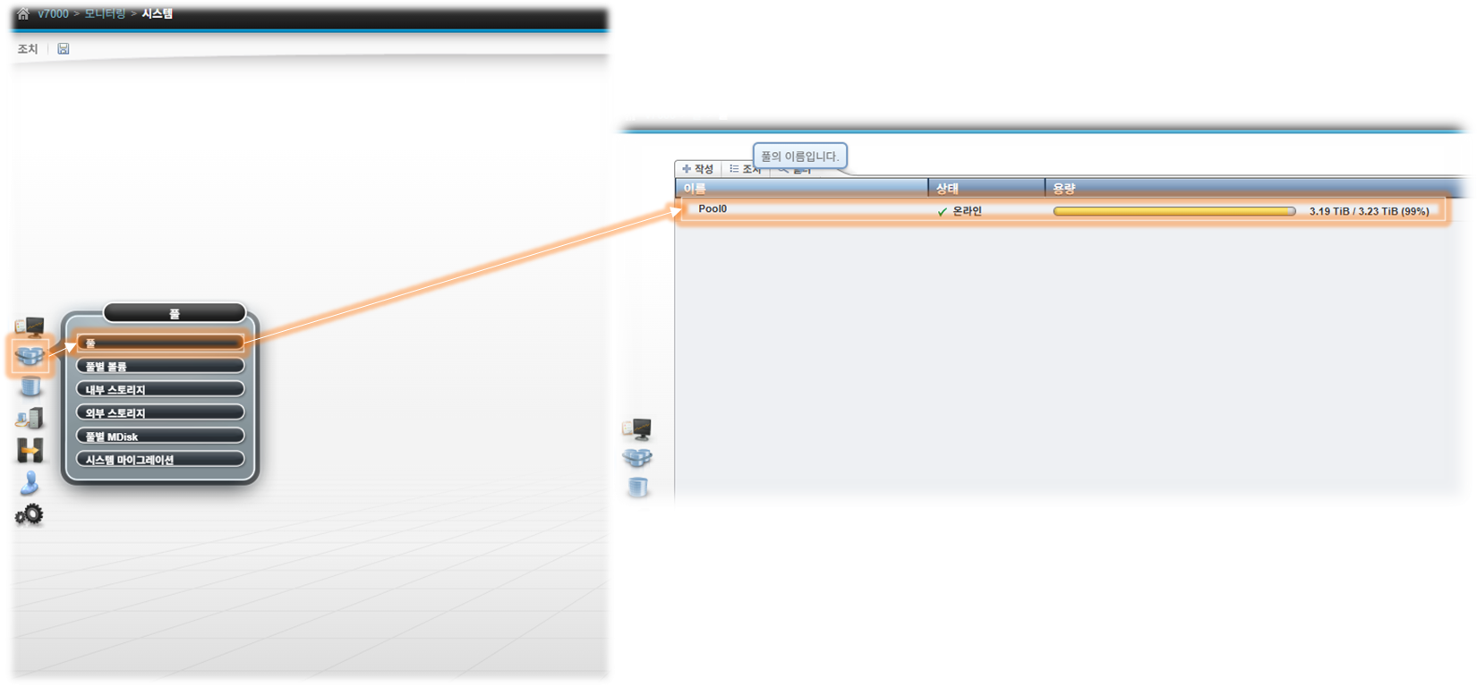 관리 콘솔에 접속하여 기존 Pool, Mdisk, Volume 정보 확인